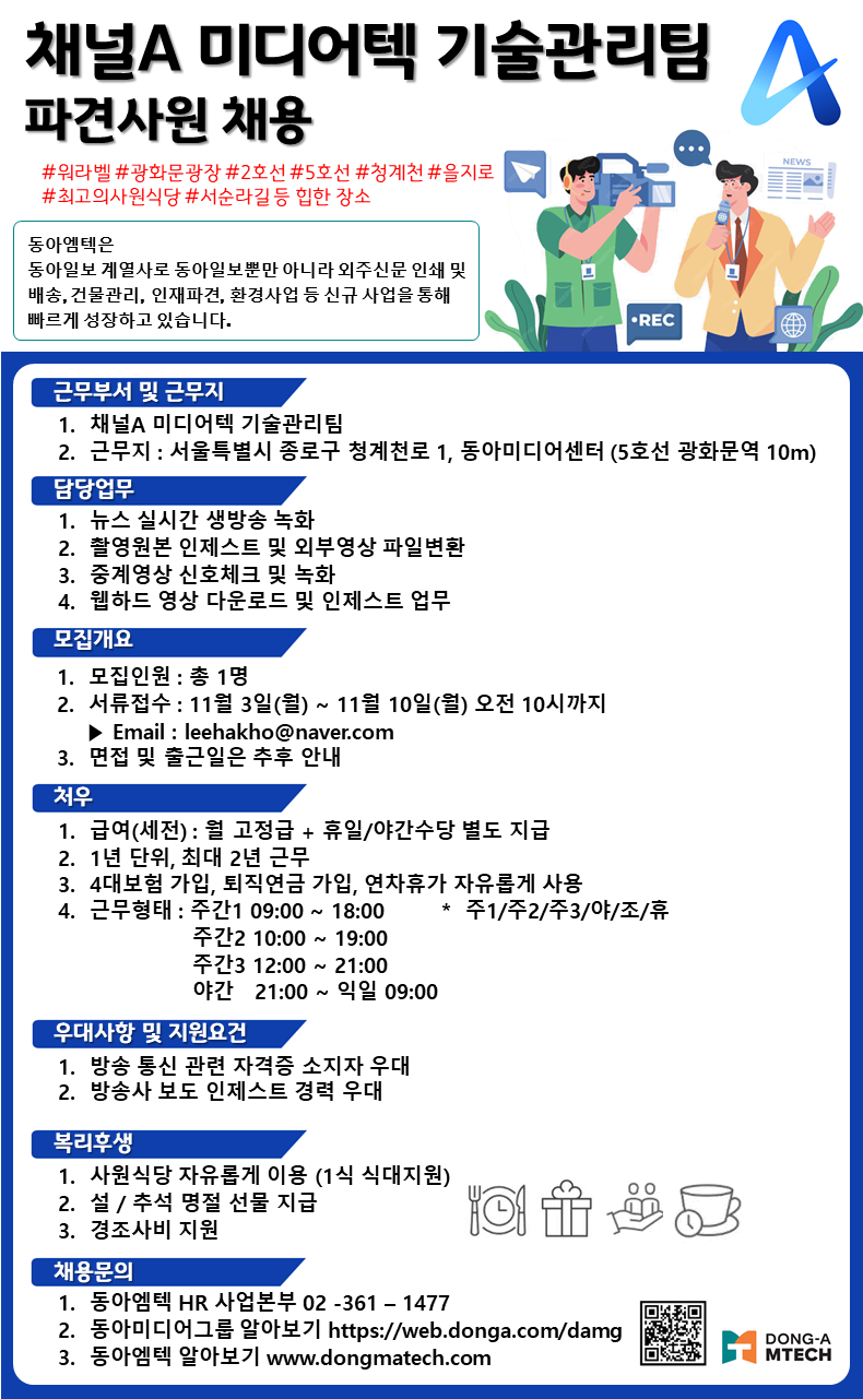 채널A 미디어텍 기술관리팀에서 파견사원 채용을 진행합니다.